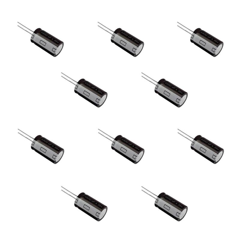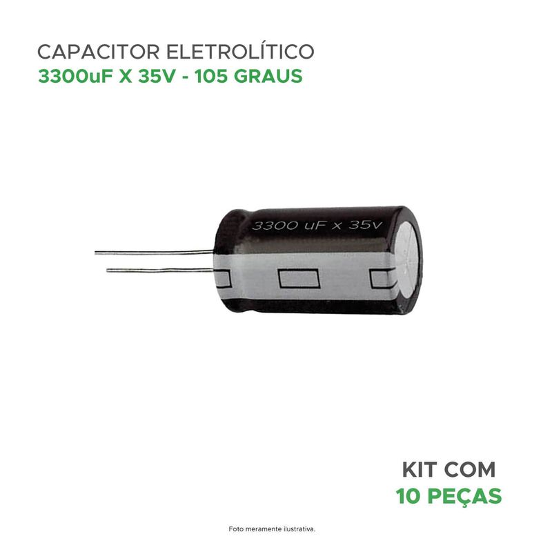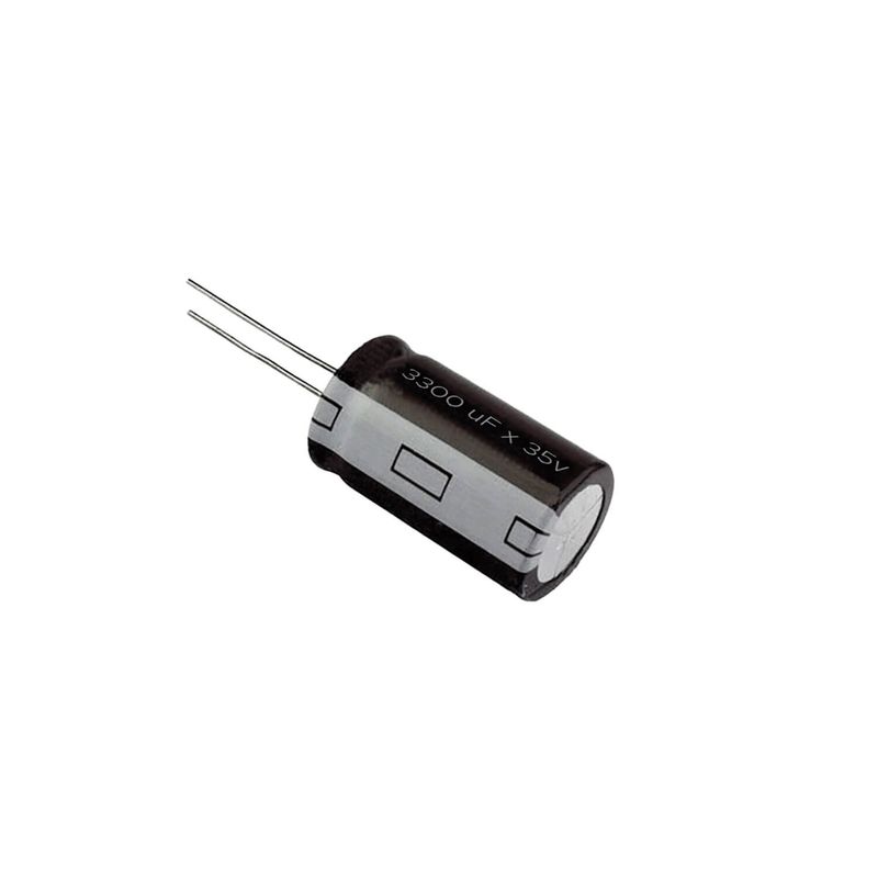 Capacitância de 3300 microfarads e uma tensão nominal de 35 volts, projetado para operar a uma temperatura máxima de 105 graus Celsius.
