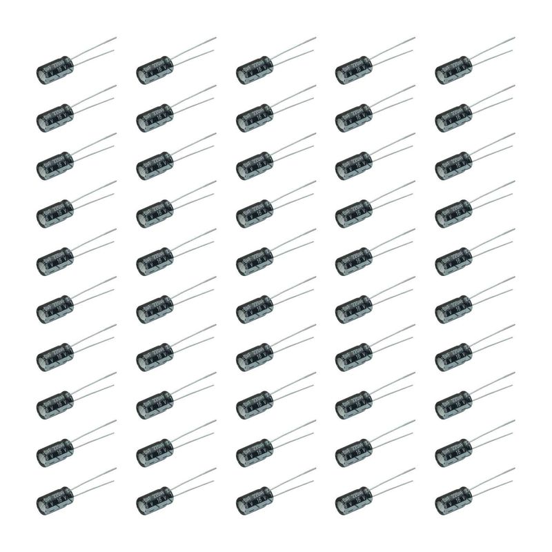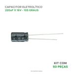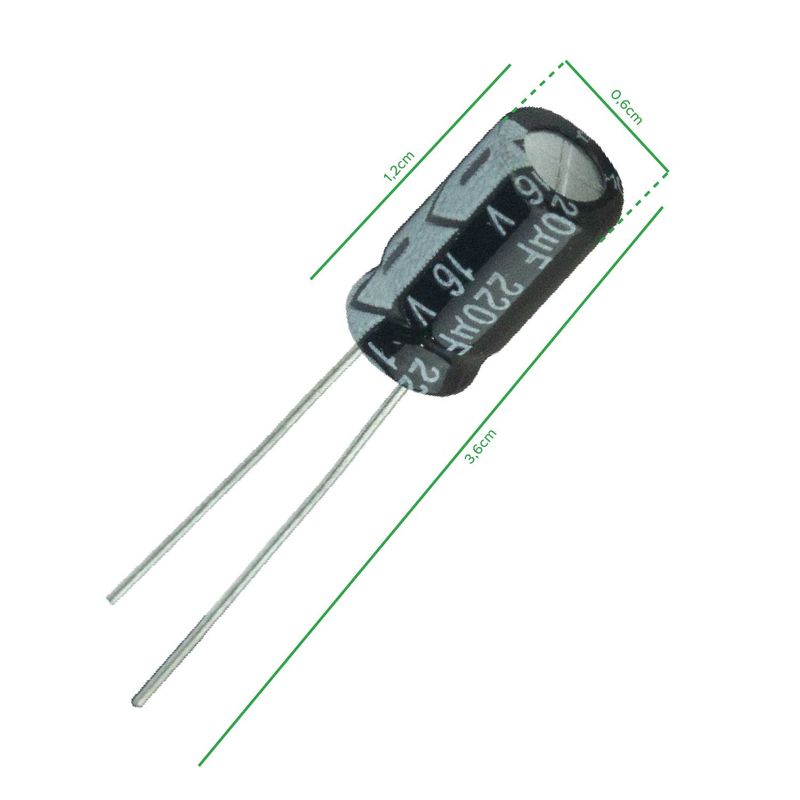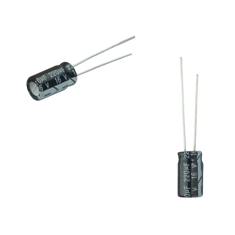 Capacitância de 220 microfarads e uma tensão nominal de 16 volts, projetado para operar a uma temperatura máxima de 105 graus Celsius.
