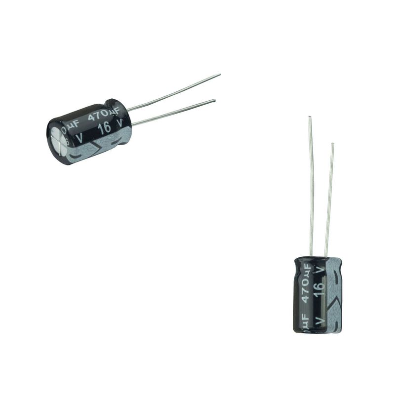 Capacitância de 470 microfarads e uma tensão nominal de 16 volts, projetado para operar a uma temperatura máxima de 105 graus Celsius.