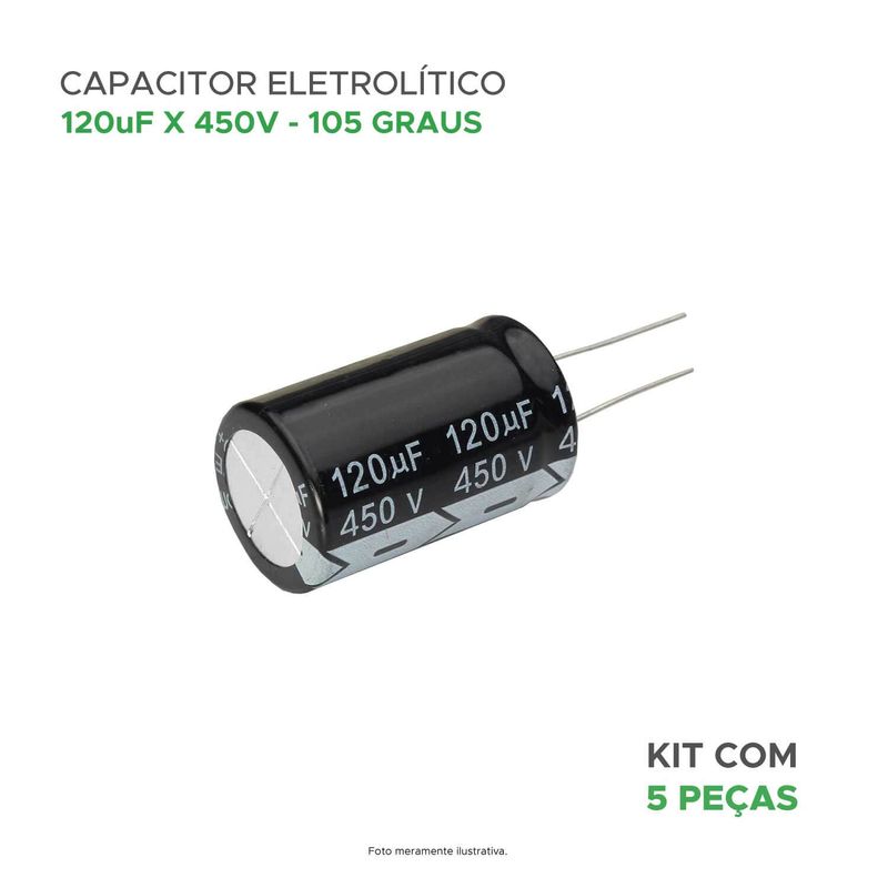 Capacitância de 120 microfarads e uma tensão nominal de 450 volts, projetado para operar a uma temperatura máxima de 105 graus Celsius.